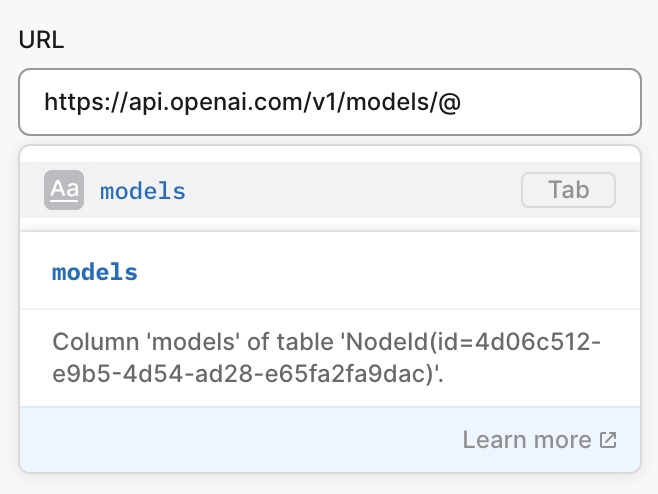 In the "URL" field, you enter the endpoint of the external API you wish to interact with. This is the web address to which the API call will be sent.