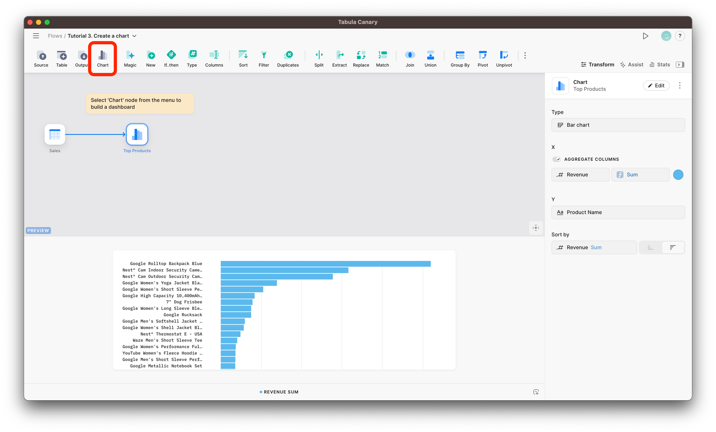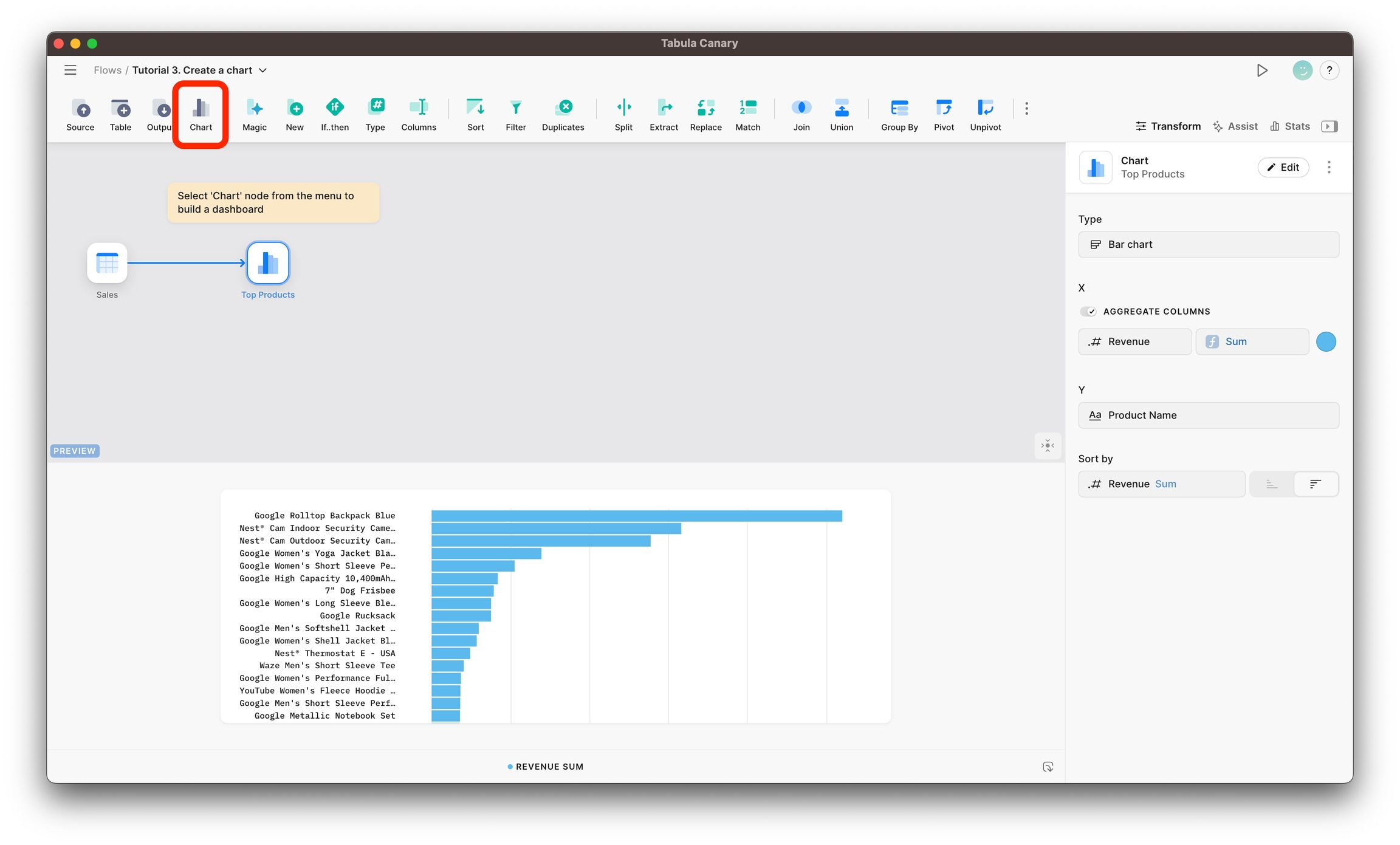 Chart node allows you to create informative charts based on your data so that you can visualize, gain insights, and design presentations.