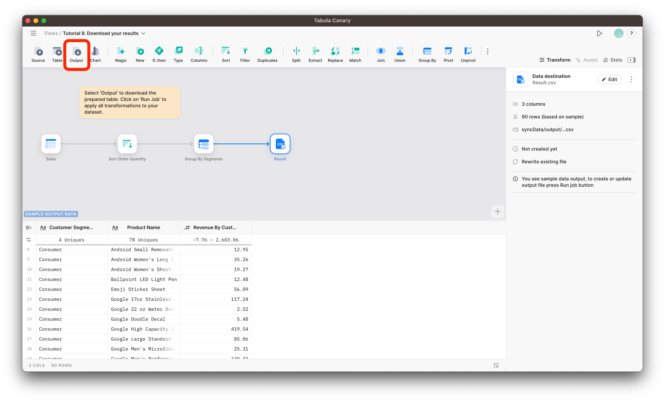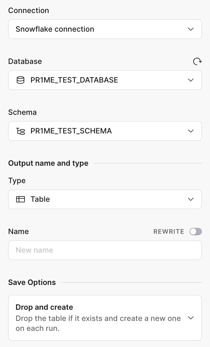 The Output Node is the final step in your data transformation process. It allows you to materialize the results of your data flows directly into your database platforms like Snowflake and Postgres or save them as a local file.