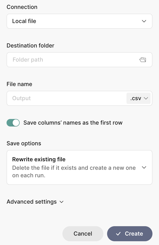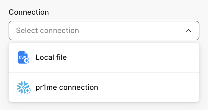 With the Output node, you can materialize results as a table or a view directly into Snowflake or Postgres or save them as a file. You only could select connectors that were used in Sources, or if you didn't use any external connectors in Source nodes, you are free to select any.