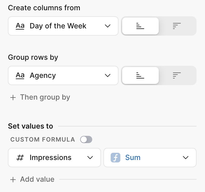 Applied only if more than one aggregated column was selected. Select "Columns" to create a new column for each aggregated column, and "Rows" to create new rows for the aggregations instead of columns.