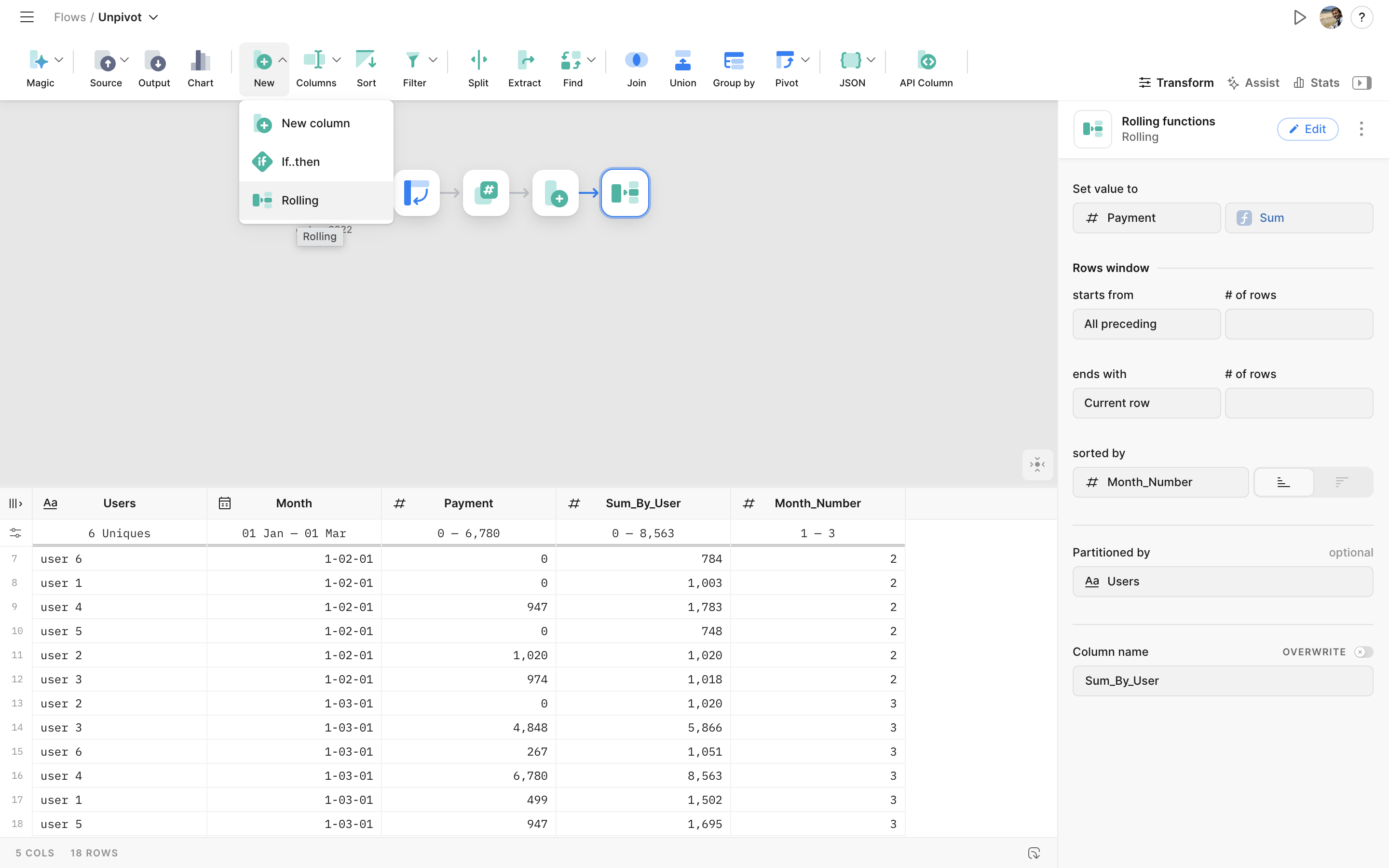 The rolling node allows you to perform calculations across a set of rows related to the current row. Unlike regular aggregate functions, which return a single value for a group of rows, window functions return a value for each row based on the rows within its "window."&#x20;