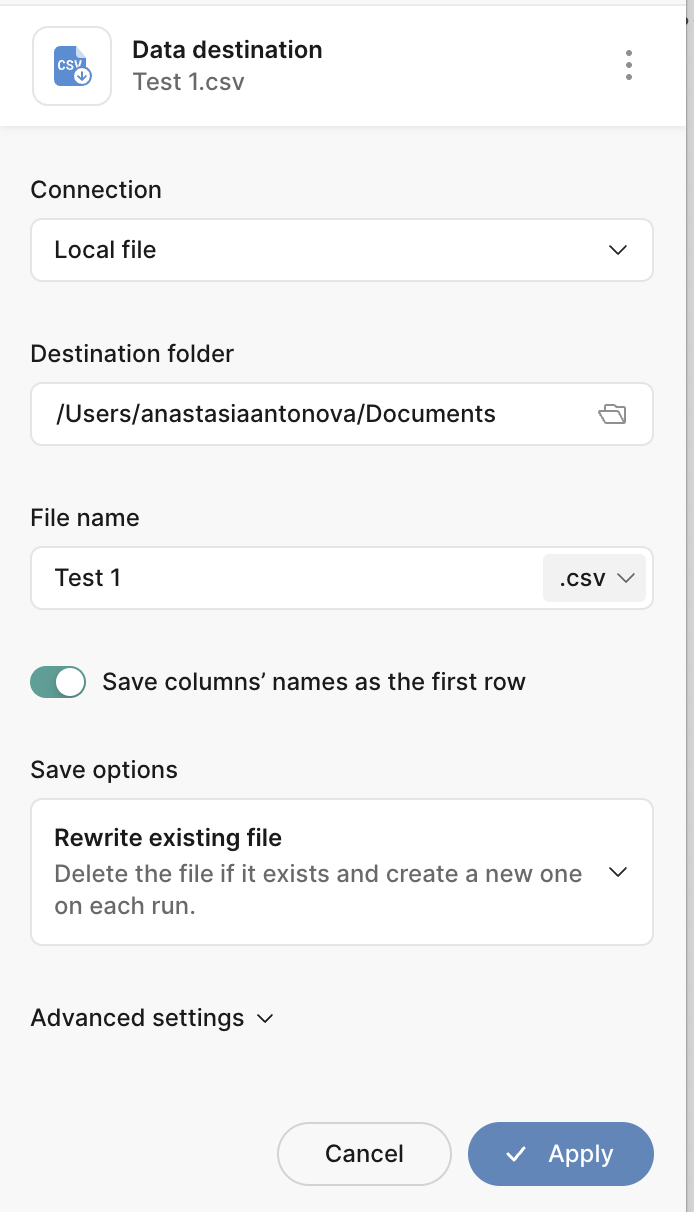 To finalize the data manipulations, you can easily export your results by clicking on the “Output” node. From there, you have the option to select a destination folder on your computer or directly push the table to a cloud data warehouse. To apply all the transformations created, simply click on the "Run" button located at the top of the screen.