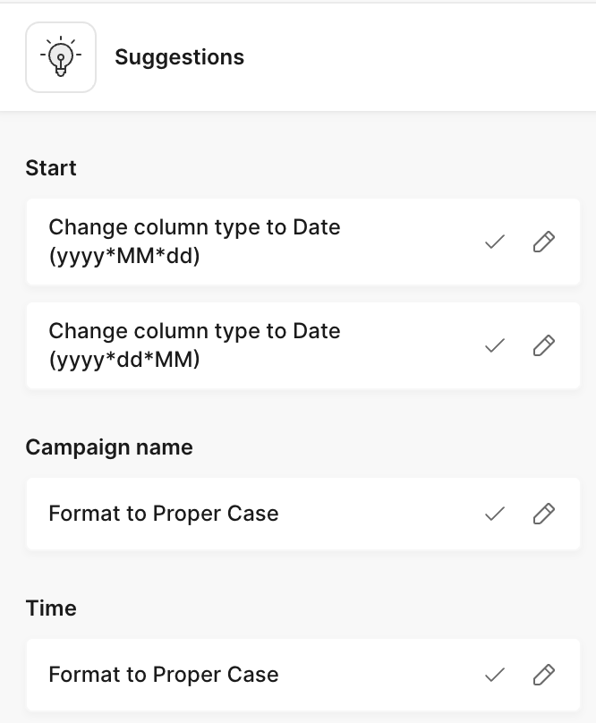 On the right side of the screen, you'll notice a range of auto-cleanup suggestions. These suggestions can help streamline your dataset by removing empty rows or formatting text case, among other options. You have the flexibility to apply these suggestions or ignore them, depending on your specific needs and data requirements.