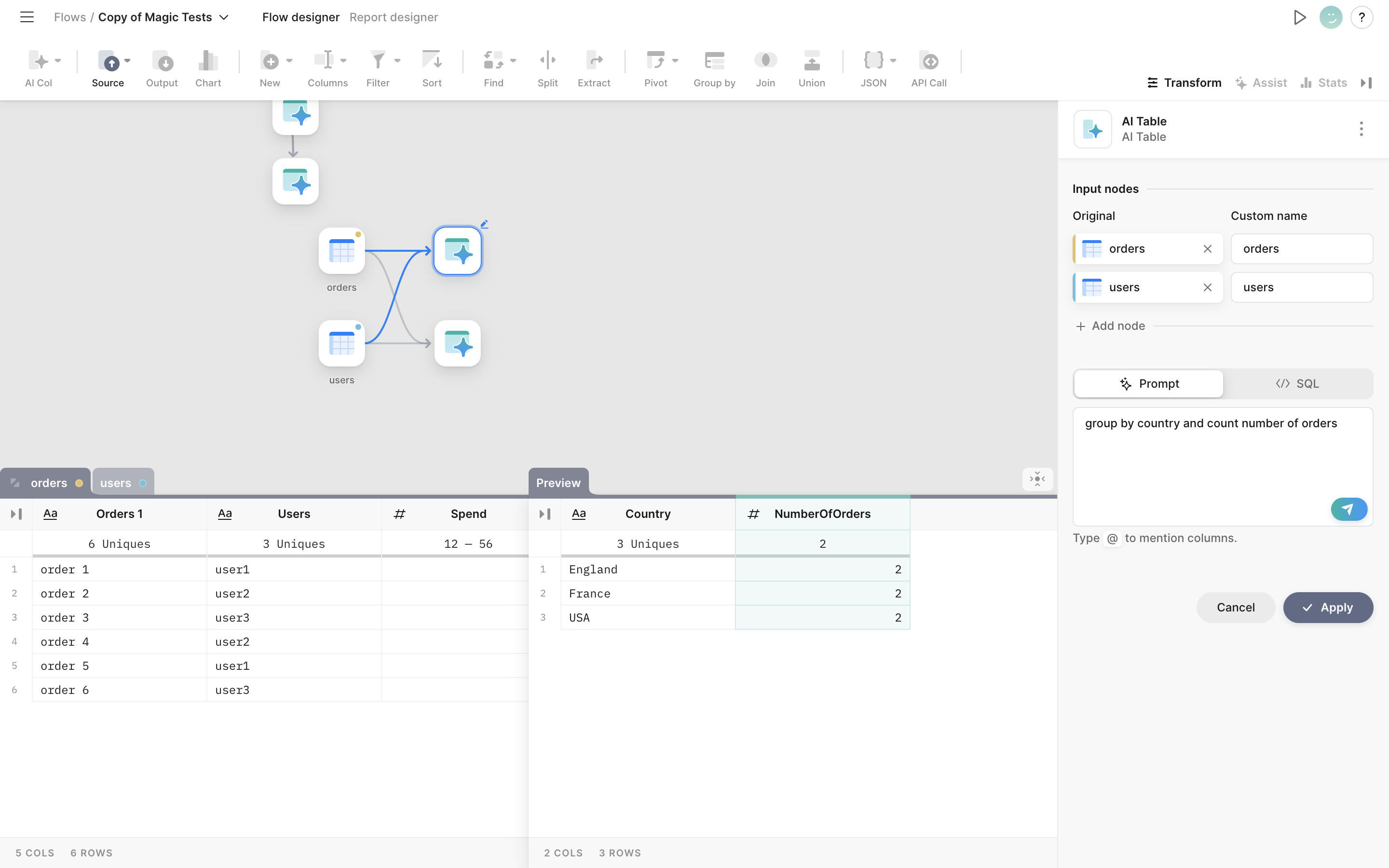 A new node where you can ask Tomat to join tables, filter, sort, or calculate fields with natural language! You can work with one or multiple tables as sources.