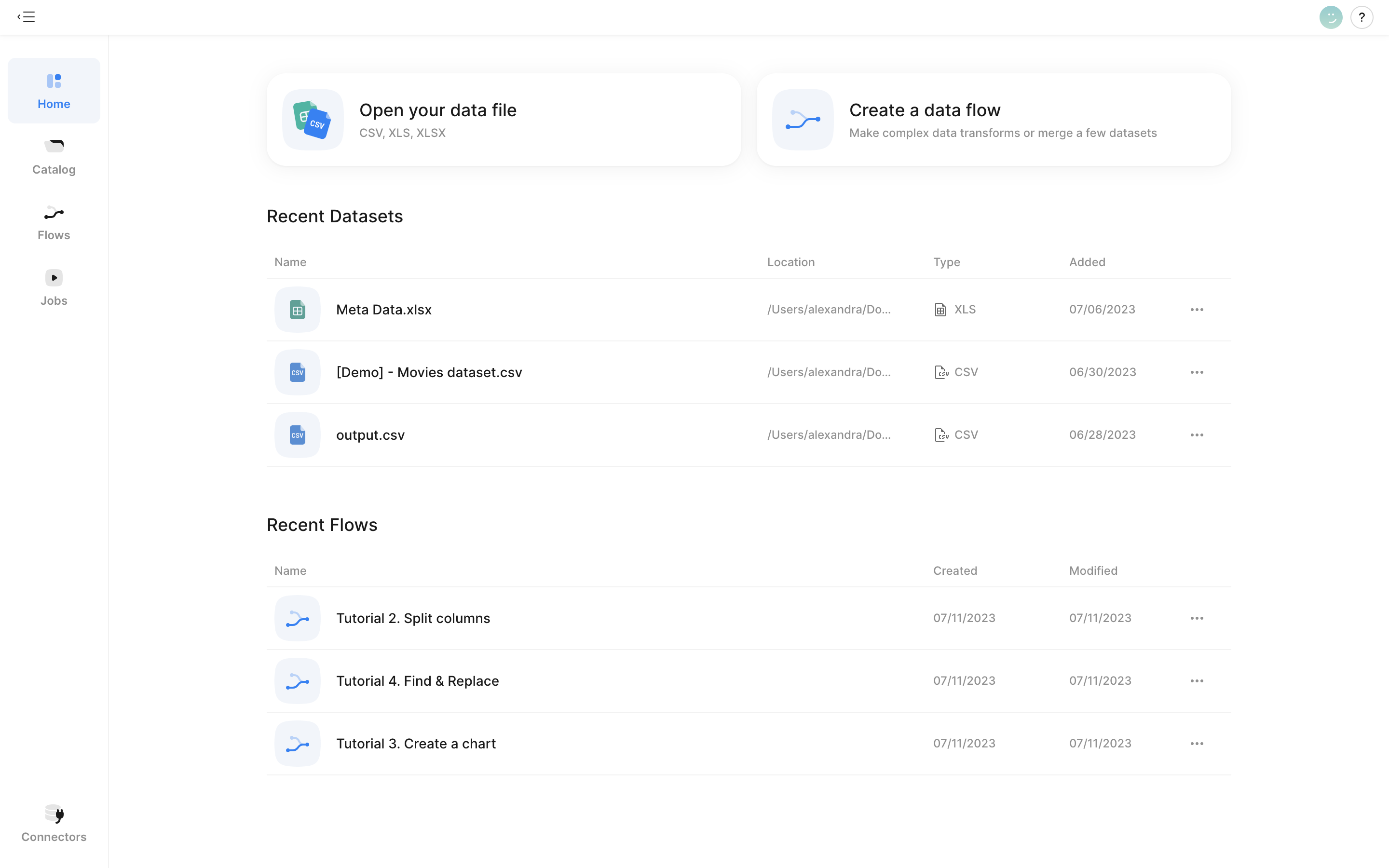 The new home page features quick links to your most recent datasets and flows for convenient navigation.